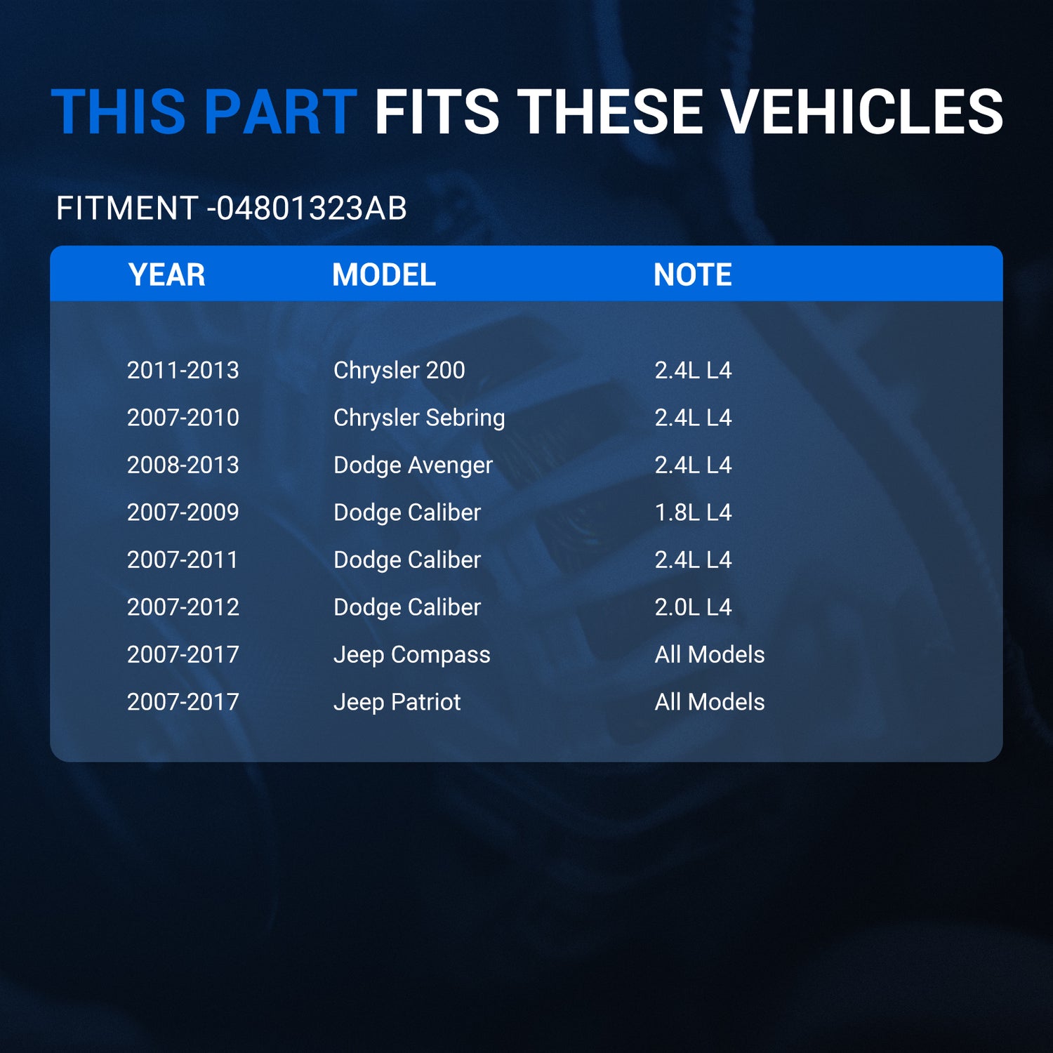 • COMPATIBILITY - 2011-2013 Chrysler 200 2.4L L4, 2007-2010 Chrysler Sebring 2.4L L4, 2008-2013 Dodge Avenger 2.4L L4, 2007-2009 Dodge Caliber 1.8L L4, 2007-2011 Dodge Caliber 2.4L L4, 2007-2012 Dodge Caliber 2.0L L4, 2007-2017 Jeep Compass All Models, 2007-2017 Jeep Patriot All Models. For details, use our vehicle selector or the fitment chart below to check compatibility.